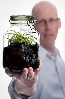 Stefan Källman är chef för Projekt- och Inköp på Hyresbostäder. På bordet framför honom står en glasburk med lock. Den ser ut som en gammaldags karamellburk, men innehållet är något helt annat. - I botten på den här burken finns det lecakulor, jord och lite vatten. I jorden växer en ampellilja, som tar upp koldioxid och producerar syre. Tittar du noga ser du också att det finns några små invånare i burken, vanliga gråsuggor som är en form av kräftdjur. Locket är ordentligt åtskruvat och det har det varit under lång tid. Det här är ett litet slutet ekosystem där djur och växter samverkar så att det blir balans. Det enda som tillförs systemet utifrån är ljus, förklarar Stefan Källman.